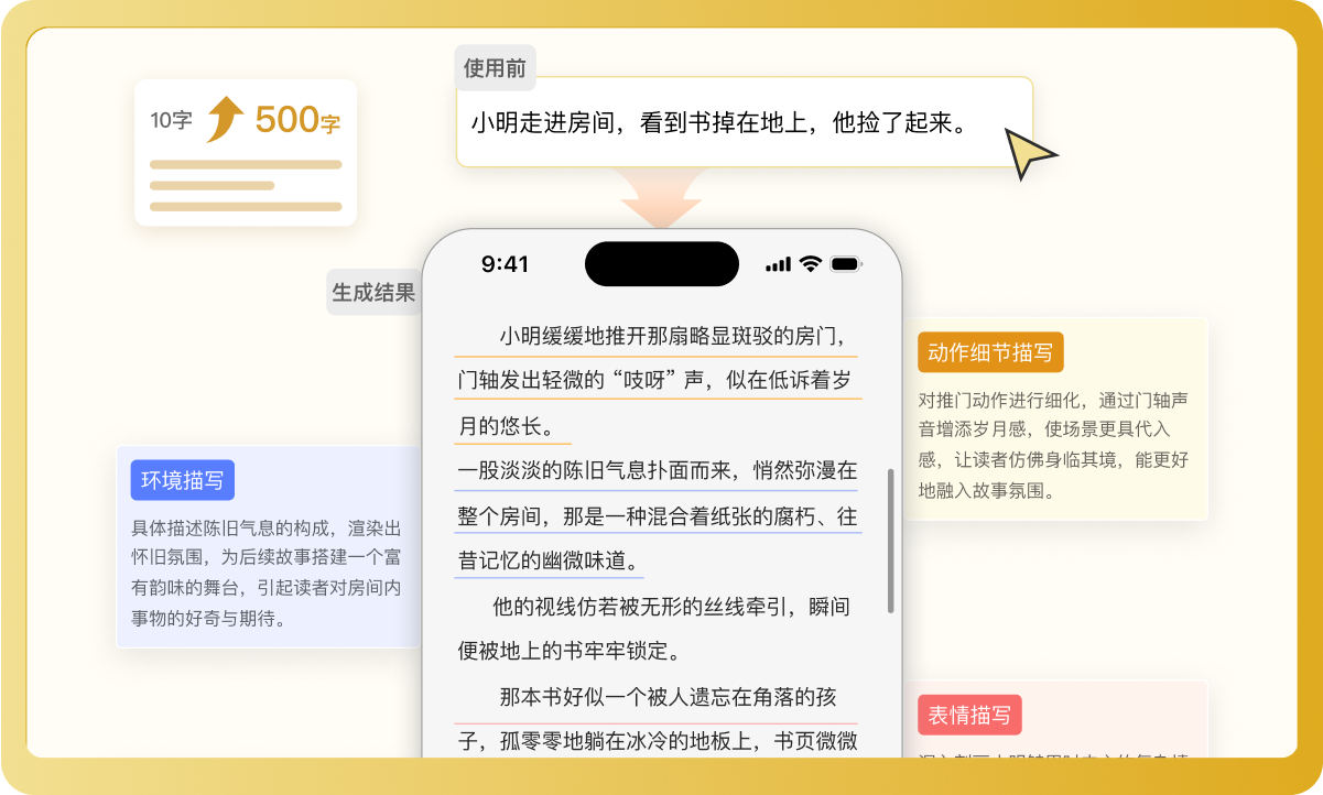 人气 34567让每个字句都充满魔力,小说扩写生成器是您的创意伙伴。当情节需要延伸,创意需要飞跃,它将为您的小说注入新的生命力。
