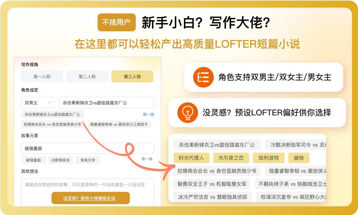 人气 30456金手指设定是赋予主角光环的神奇钥匙。创意受限?小说金手指设定生成器来助阵!AI帮您构建合理又吸引人的特殊设定,让主角之路既充满奇迹。